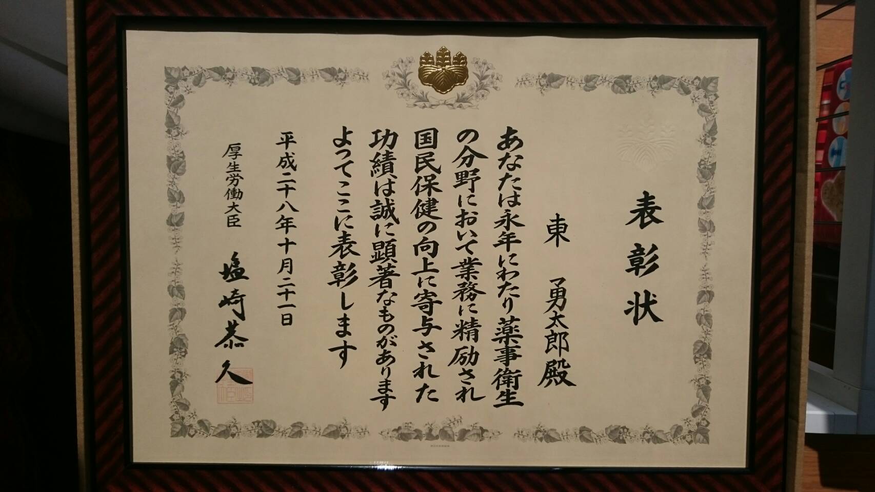 21日 10月 2016 2016年10月21日 薬事功労者厚生大臣表彰 10月21日、弊社の代表取締役・東勇太郎が、多年にわたり薬事関係事業の発展や国民保健の向上に寄与した功績により厚生労働大臣より表彰を受けました。 tagPlaceholderカテゴリ: 東社長, 2016年度