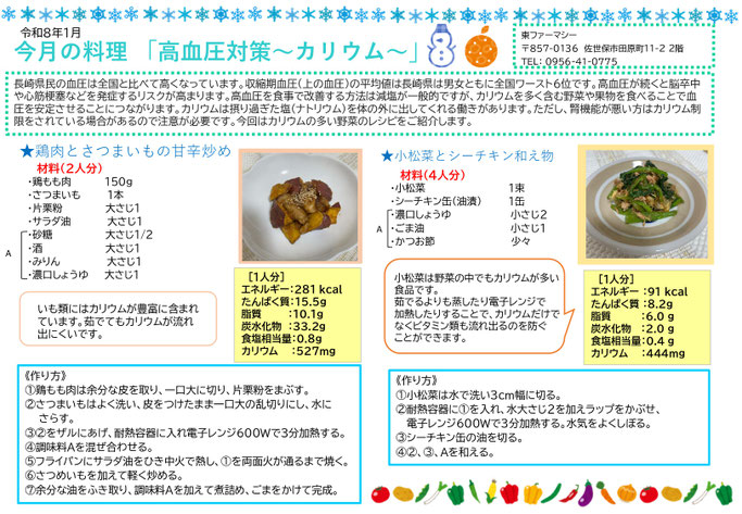 長崎県民の血圧は全国と比べて高くなっています。収縮期血圧(上の血圧)の平均値は長崎県は男女ともに全国ワースト6位です。高血圧が続くと脳卒中や心筋梗塞などを発症するリスクが高まります。高血圧を食事で改善する方法は減塩が一般的ですが、カリウムを多く含む野菜や果物を食べることで血圧を安定させることにつながります。カリウムは摂り過ぎた塩(ナトリウム)を体の外に出してくれる働きがあります。ただし、腎機能が悪い方はカリウム制限をされている場合があるので注意が必要です。今回はカリウムの多い野菜のレシピをご紹介します。